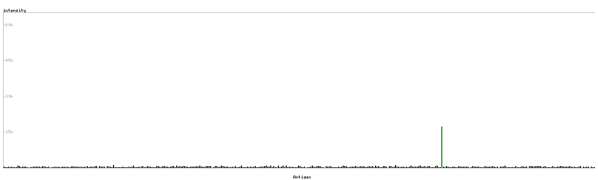 At the top of the view, the position of the antigen (identified by the corresponding HPA identifier) is shown as a green bar. A yellow triangle on the bar indicates a <100% sequence identity to the protein target.