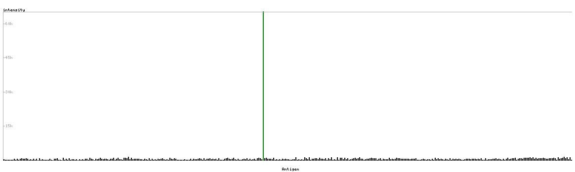 At the top of the view, the position of the antigen (identified by the corresponding HPA identifier) is shown as a green bar. A yellow triangle on the bar indicates a <100% sequence identity to the protein target.